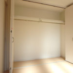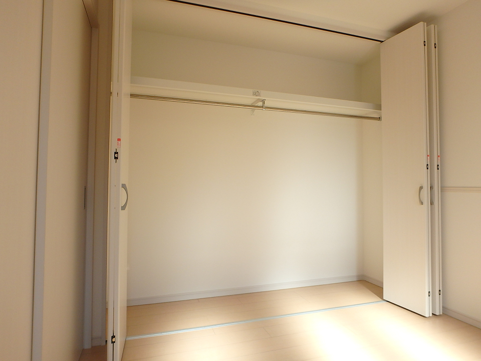 壁一面のクローゼット。スライド扉で、ご覧のように開口できます。探し物が簡単に見つかります。