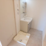 洗面所には独立洗面台と洗濯機を置くための防水パン。隣が浴室なので、脱いだ衣服を洗濯機へポイできます。広さも十分!