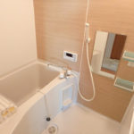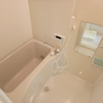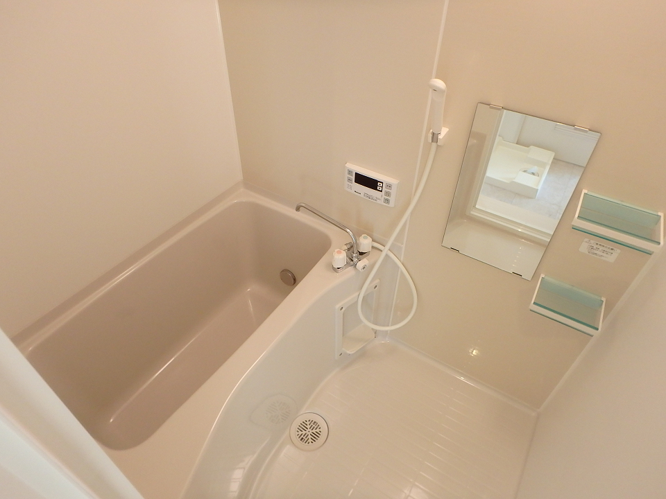 浴室には追い焚き、浴室乾燥機などの人気機能が!写真ではわかりにくいですが鏡のある面はカラーパネルです。2階のお部屋と色合いが違うので、このページの下部にあるギャラリーで見比べてください。