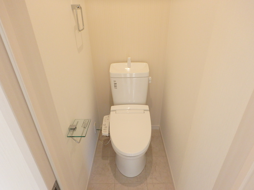 温水洗浄機能のあるトイレ。清潔感のある色使いです。