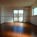 1階のリビングは12.7帖あります。2階のお部屋とはフローリングの色など部分的に違いがあります。 室内物干し設備があるので、雨の日でも洗濯物が乾かせます。