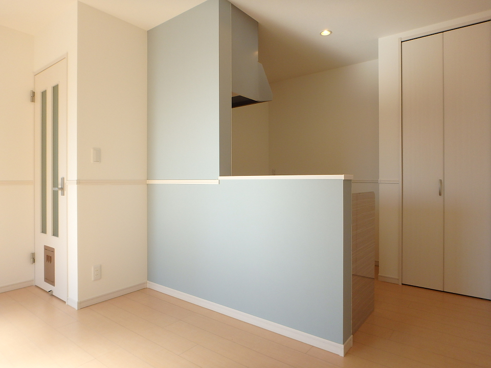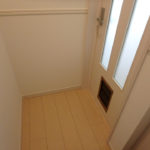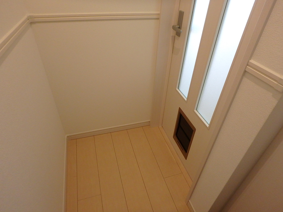 玄関口から撮影。右手扉下部にペット用の出入口があります。ペットに送り迎えしてもらいましょう♪