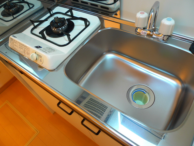 1口ガスコンロのキッチンです。調理器具の収納などを工夫してスペースを保つと、効率がよさそうです。