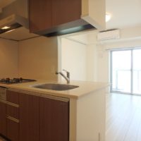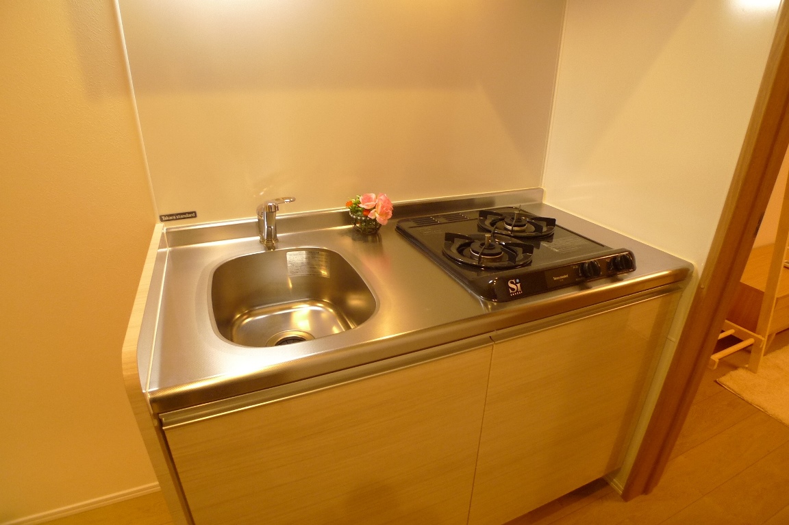 2口ガスコンロ、シングルレバー水栓のシステムキッチンです。キッチン脇には冷蔵庫を置くために十分なスペースがあります。