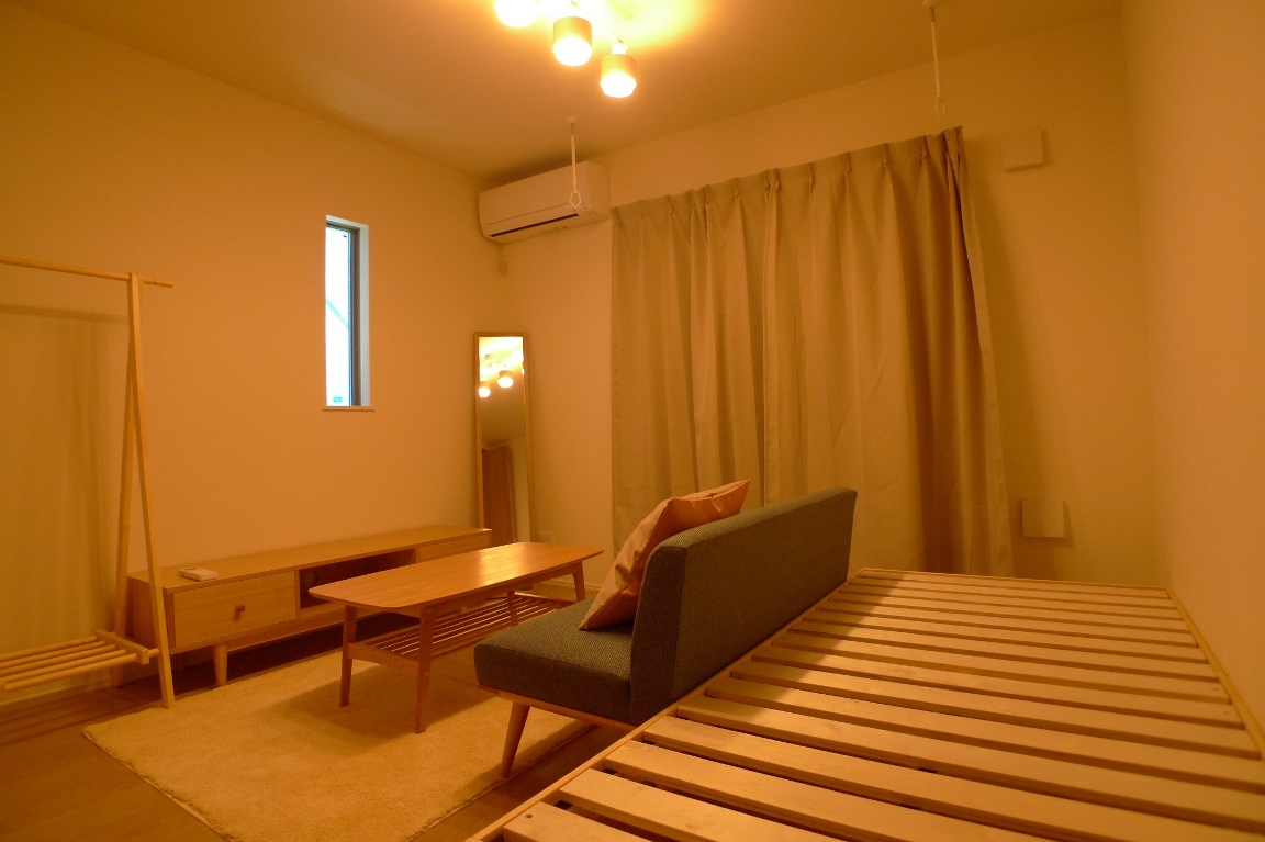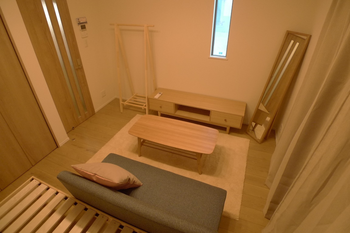 こちらのお部屋では、ベッド、ソファ、リビングテーブル、TVボード、ハンガーラック、スタンドミラー、カーペット、クッションがモデルルームのために用意されました。