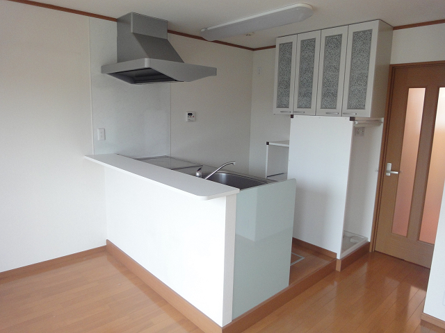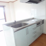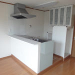 ▼カウンタータイプのシステムキッチンです。棚が背面にあるので、視界が広く感じますね。