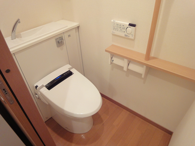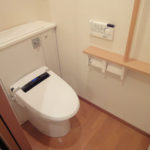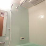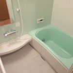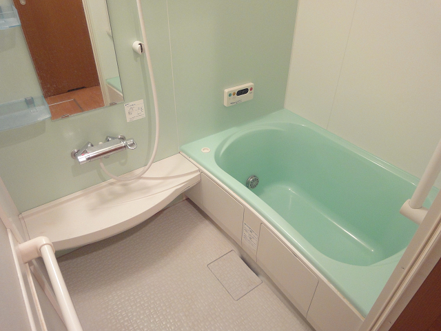 ▼さわやかなカラー浴槽。前面のパネルにも同系カラーで一体感がありますね。洗い場も大きく、使い勝手もよさそうです。嬉しい追い焚き機能や浴室乾燥機能も付いています♪