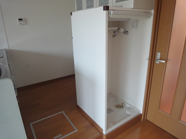 ▼キッチン脇に、洗濯機置場があります。ロールカーテンで洗濯機を隠せるように工夫されています。