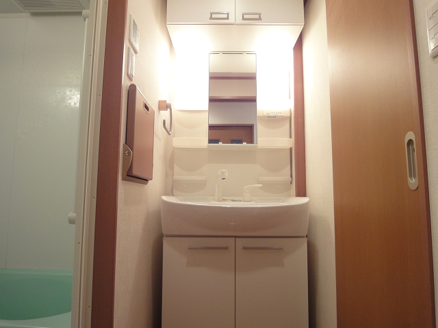 ▼シャワー式の独立洗面台を採用。洗面台の左側にある物体は、引き出してテーブルとして使えます。
