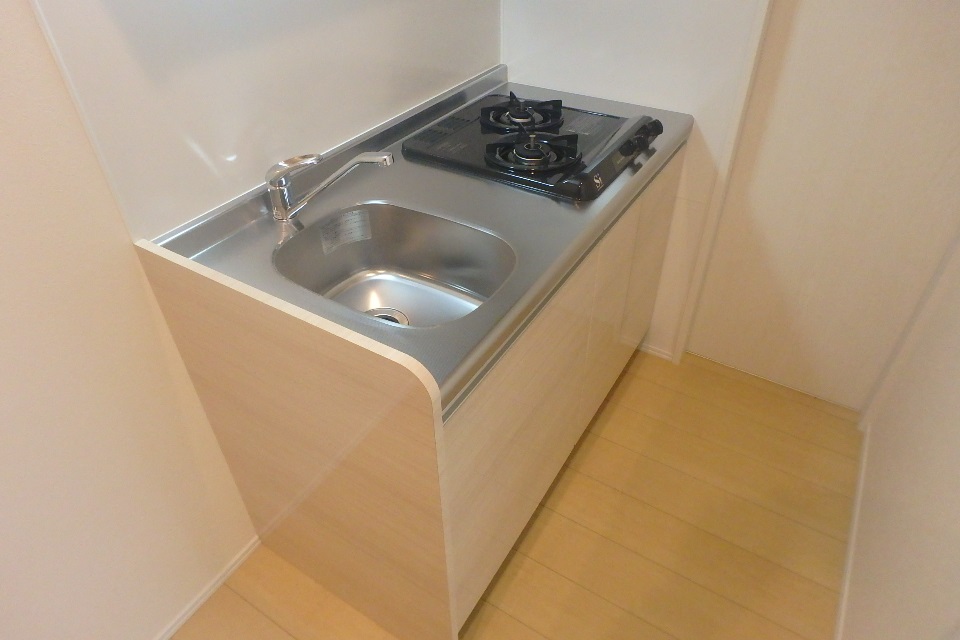 キッチンは2口ガスコンロのシステムキッチンです。 廊下にあるので、料理のにおいが部屋に入りません。