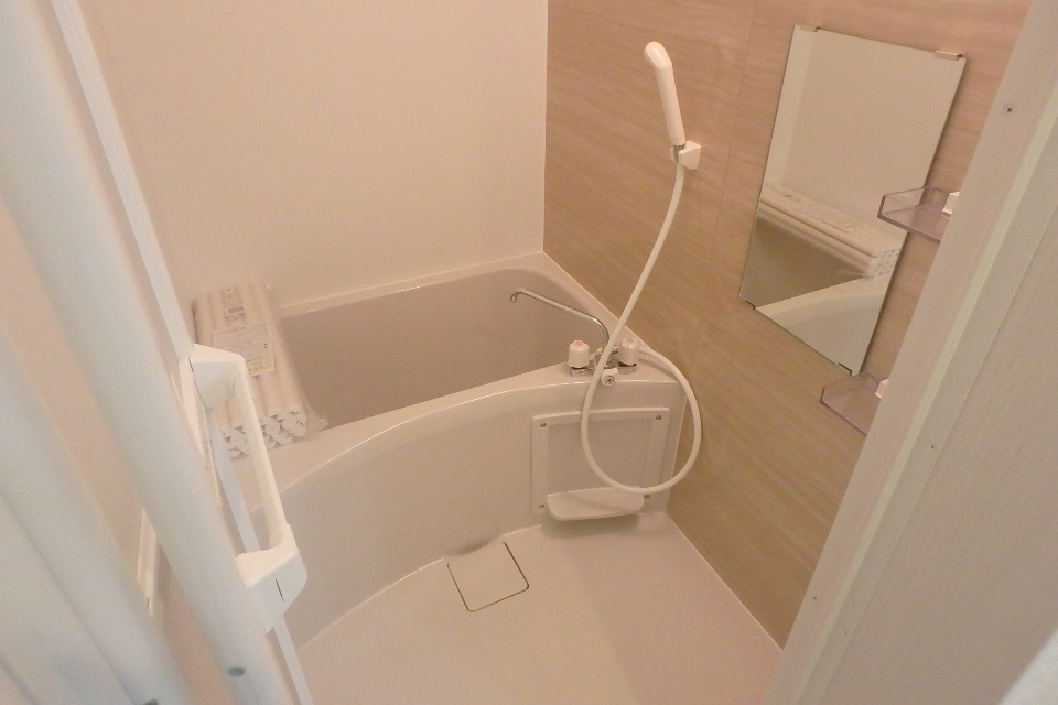 浴室乾燥機付きのバスルーム。 鏡の横には、ボディソープやシャンプーなどを置くための棚が設置されています。