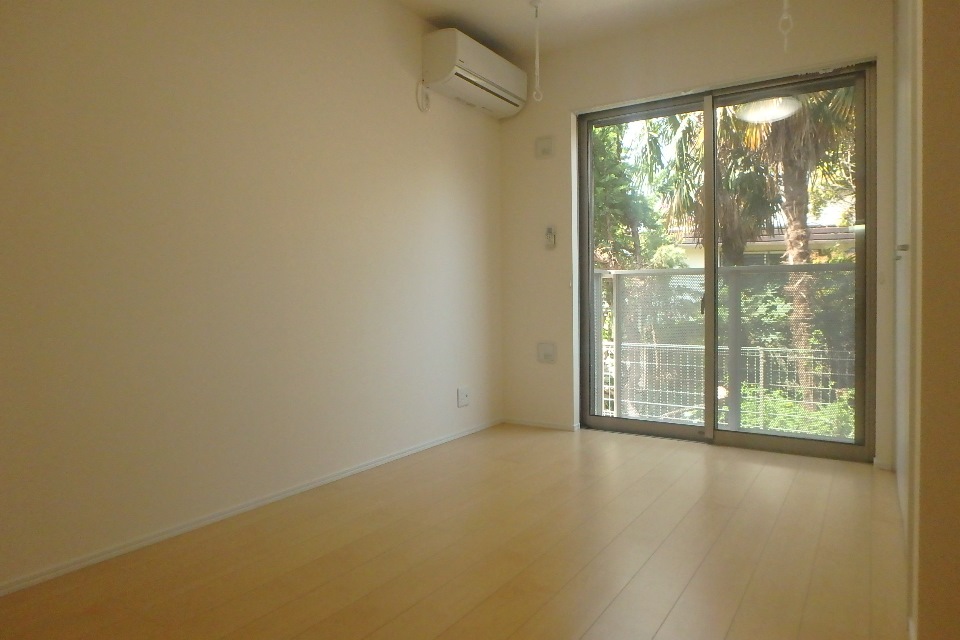 お部屋には、明るい色のフローリングを使っています。 1階のお部屋ですが、バルコニーは公道に面しておらず、外からの視線が気になりません。