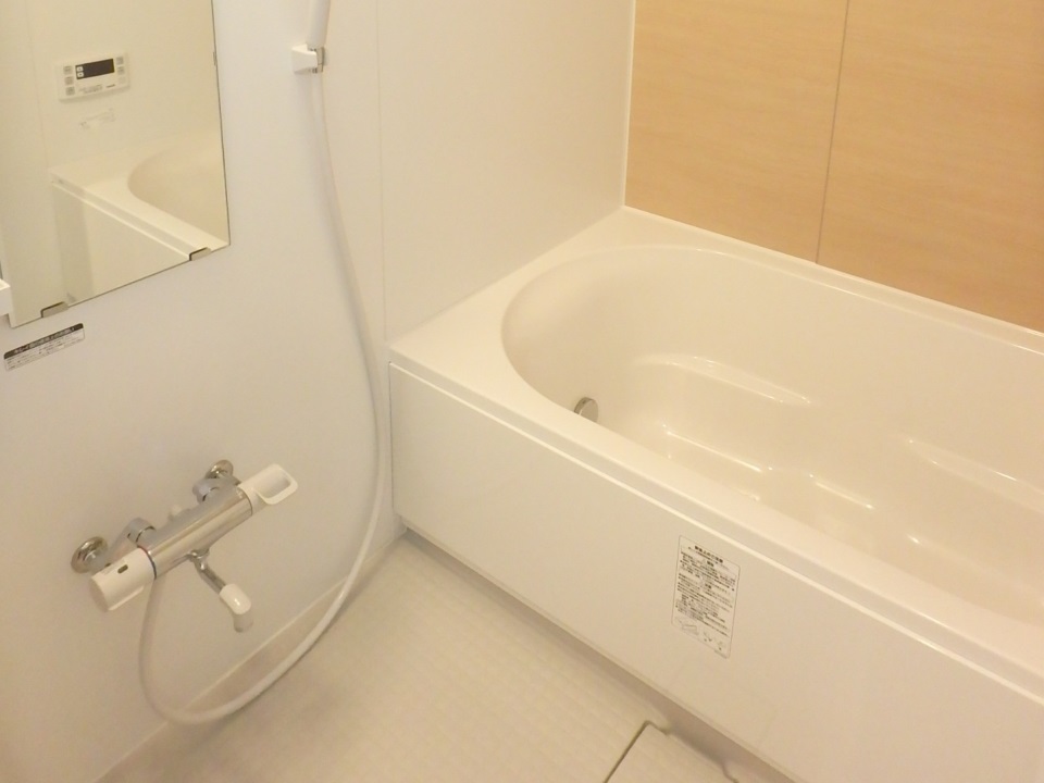 追い焚き、浴室乾燥機付きのバスルーム。木調のアクセントパネルで高級感アップ!