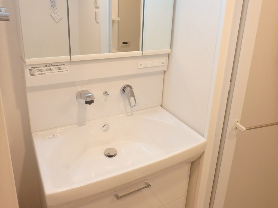 独立洗面台は三面鏡タイプです。ワイドに使える壁付き水栓。