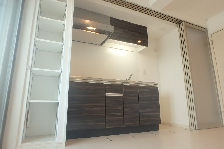 ▼ キッチンも単身用とは思えないほど、ハイグレード。2口のIHクッキングヒーターが使えます。左側にある食器棚も便利!