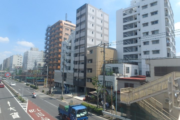 ▼ 前面は写真のように大きな道路が走っています。都内では、バルコニーを開けるとすぐ他の建物の窓があることが多いですが、これなら人目が気にならないですね! 通り沿いに歩くと、オートバックスやホームセンターも利用できます。