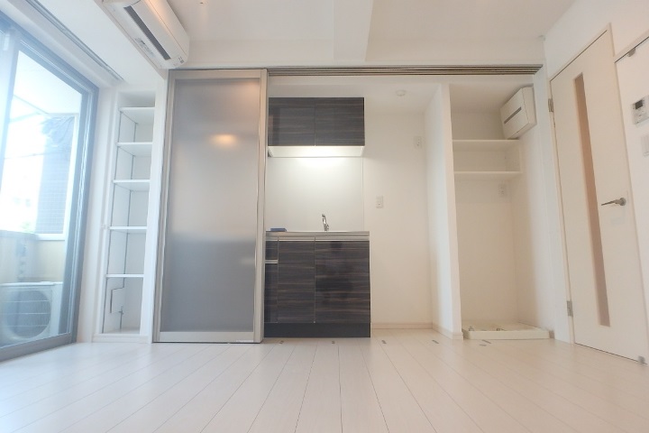▼ 生活感が出やすいキッチン・洗濯機置き場は、4枚の樹脂ガラス扉で隠せます。天井から吊るしている扉なので、動きが軽い。ばらつかないよう床にあるマグネットで固定できるのです。見た目におしゃれで、機能的ですよ!