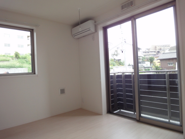 リビングは約11帖大。フローリング床は明るめの色を採用しております。角部屋は2面採光なのでより室内を明るく光が差し込みます。室内にはエアコン、室内物干し竿等の設備があります。隣は洋室、奥はバルコニーです。