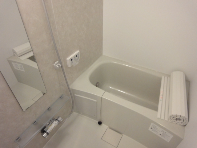 バスルームは給湯器付きです。追い焚き機能が付いているので、いつでも暖かい湯船にゆったり入れます。鏡も大きく見やすいですよ♪シャンプーボトルなどを置くスペースもしっかりと確保されております。写真では少しわかりにくいですが、一面だけ壁に柄が入っていて高級感あふれる浴室となっております。
