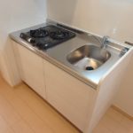 ▼ キッチンは幅約113㎝とコンパクトなシステムキッチン。2口ガスコンロで難易度の高い調理にもチャレンジできます。キッチンパネルが施され、油汚れなども掃除しやすい機能的な台所。