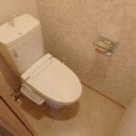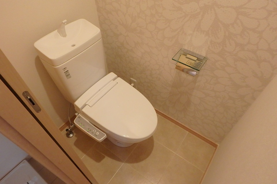 ▼ トイレは温水洗浄暖房便座。壁の一部に上品なデザインクロスがあしらわれ、落ち着く空間に仕上がっております。