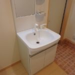 ▼ 103号室の独立洗面台は玄関そばに配置されています。お出かけ前に身だしなみをチェックしたり、室内に入る前に手洗いできるのも便利です。