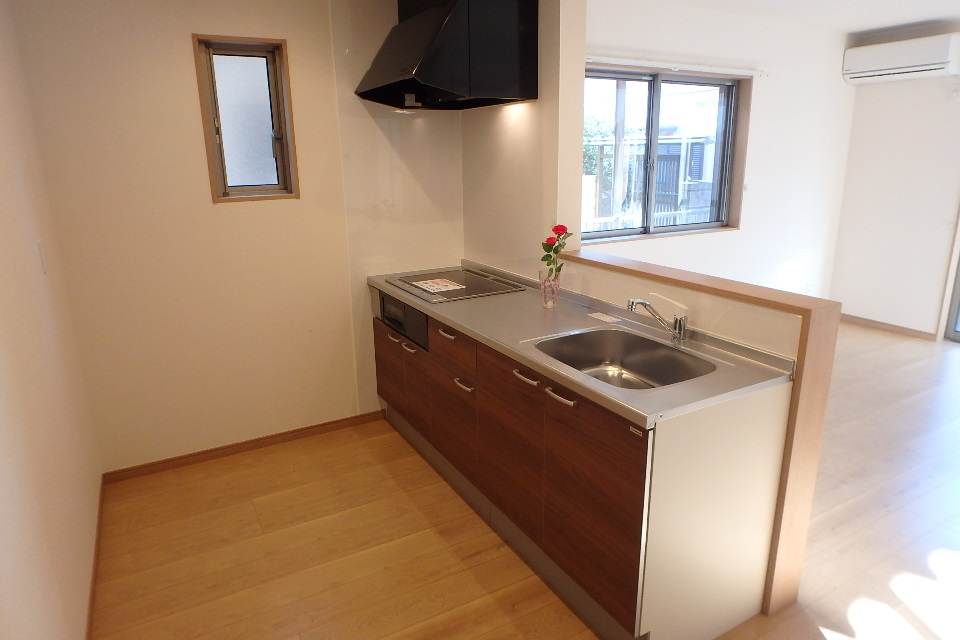 カウンタータイプのキッチンから、お部屋が見渡せます。コンロはIHタイプです。