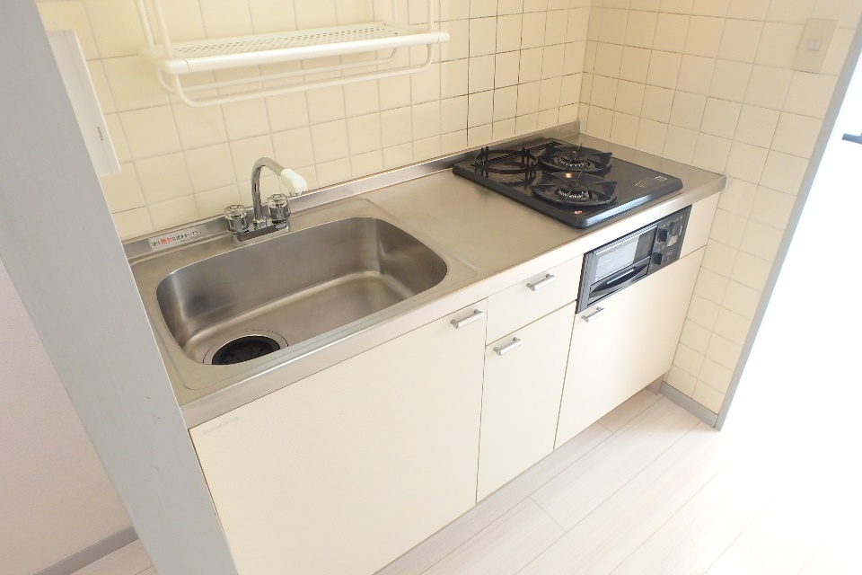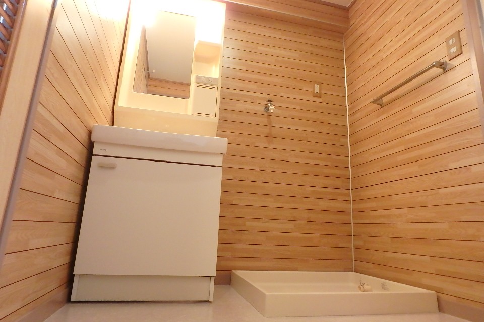 ▼キッチンは2口ガスコンロ。グリルもついています。▼収納スペースが2箇所にあります。▼あたたかみのある木調の壁で囲われた洗面所です。独立洗面台の隣には、洗濯機置場があり、脱衣所もかねております。▼追い焚き機能のある浴槽です。▼トイレには新品の温水洗浄便座が設置されました。(2015年3月)