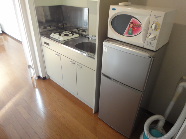 下の写真は、通路部にあるキッチン。ガスコンロタイプで冷蔵庫が置けるスペースも十分あります。
