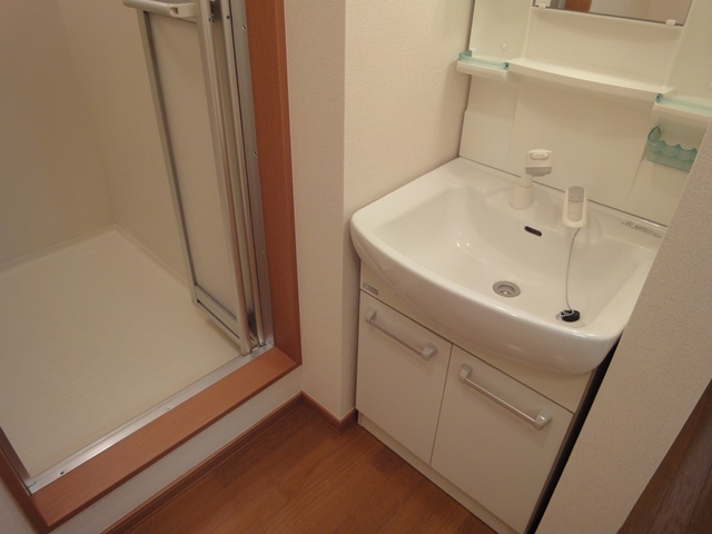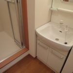 ▼独立洗面台が浴室の隣に設けられています。カーテンなどで仕切れば脱衣スペースにも丁度よい広さです。