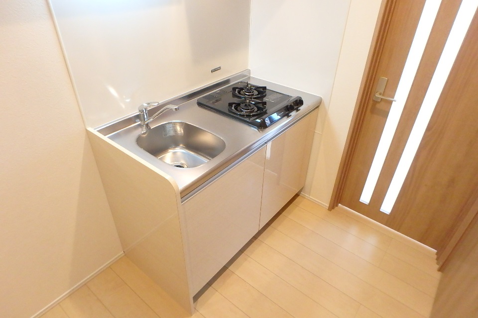 2口ガスコンロのシステムキッチンです。周囲は汚れがつきにくいキッチンボードで仕上げ。