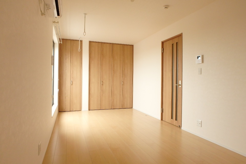 ベッドを置いても、まだまだ空間が残りそうです。これならソファーやデスクも置けますね。さらに壁一面がクローゼット!