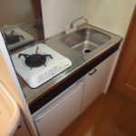 ▼1口ガスコンロのシステムキッチン。 ミニ冷蔵庫付きです。