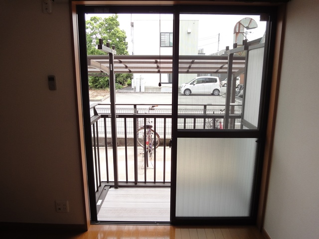 ▼バルコニー前は駐輪場。さらに、その先は駐車場。 道路ではないので、あまり人目が気にならない。