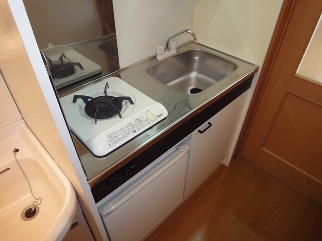▼1口ガスコンロのシステムキッチン。 ミニ冷蔵庫付きです。