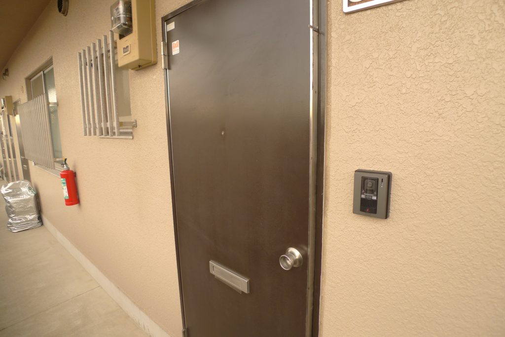 玄関前に来ました。これだけ見ると1980年代後半の一般的な賃貸マンションの雰囲気です。