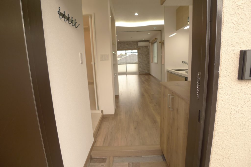 さぁ、カードキーを差し込んでくいっとノブを回して、玄関扉を開けます。リノベーションによって実現した広々ワンルームの奥行きが感じられます。