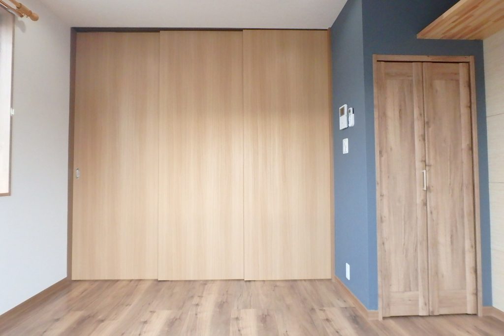 この方向から右手を見ます。クローゼットと作り付け天板収納といったらいいのでしょうか、5段のオープン棚があります。ここは、普通の収納にするのではなく、インテリア小物や自分の趣味のコレクショングッズなどを並べるのがよいですね。オープン棚でいつでも自分の好きなものが目に入る生活って、ワクワクしますよね!