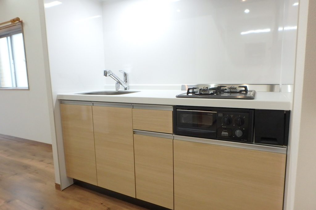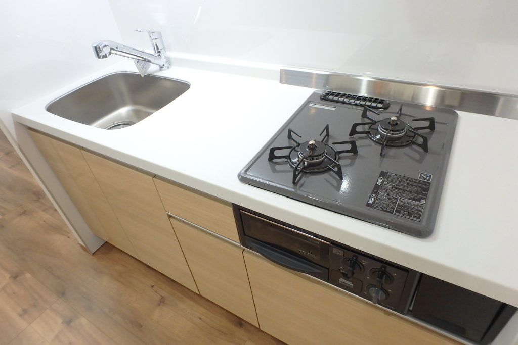キッチンはシステムキッチンになってます。2口ガスコンロと魚焼きグリル付き!