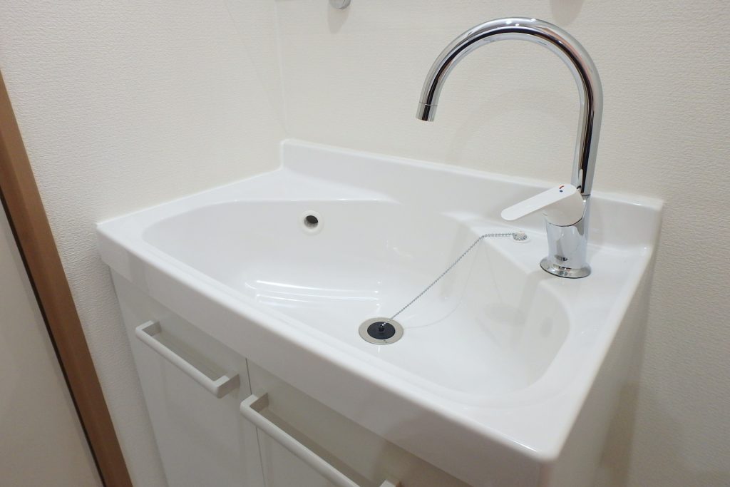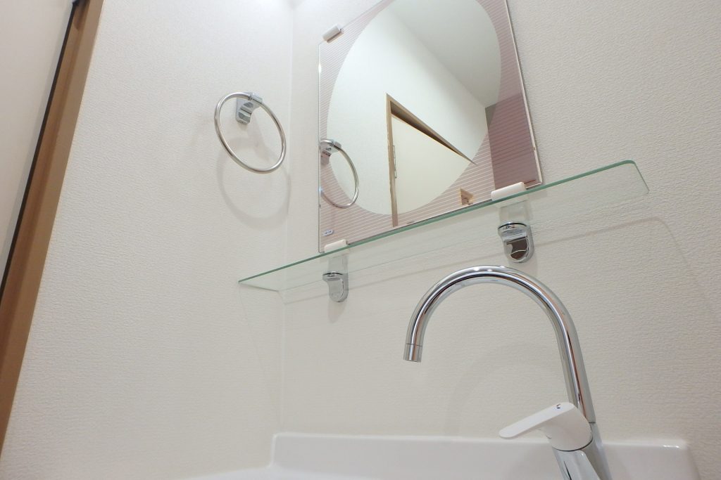 洗面台です。これは今回のリノベーションで、新しく取り付けられました。スペースの関係上で、すこし小さ目ではありますが、洗面ボウルの形状を三角のものを採用し、小さいながらも実用性を損なわずに設置することができました。