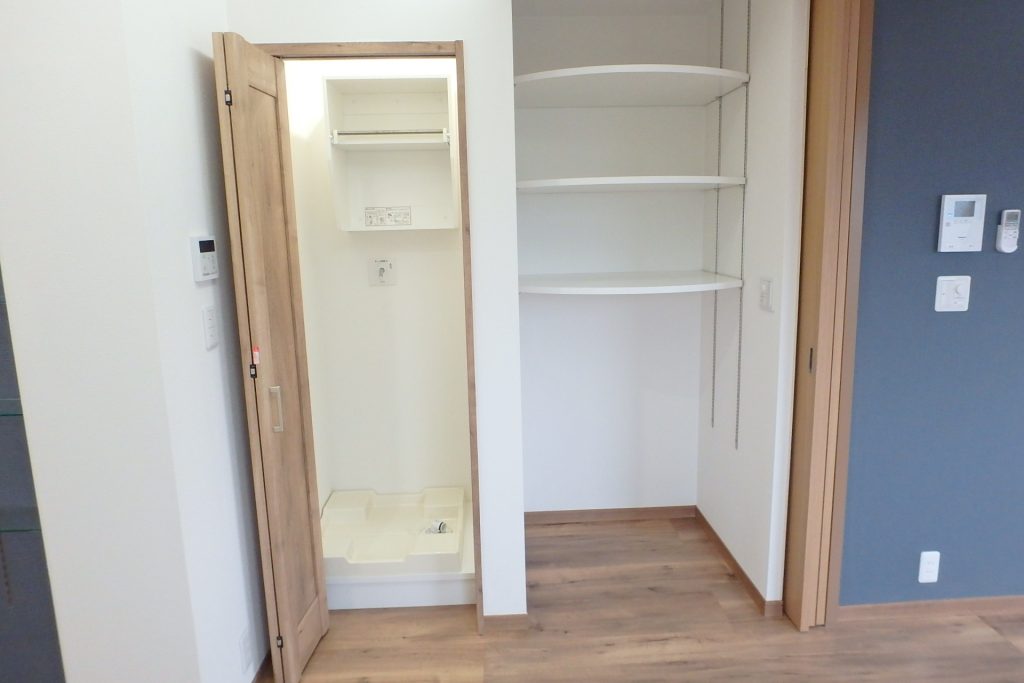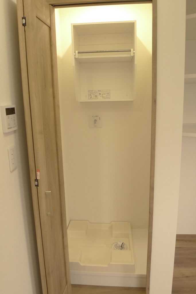 洗濯機置場は、収納扉付きです。洗濯をしないときは扉を閉めておけば「生活感」を出さずに済みます。