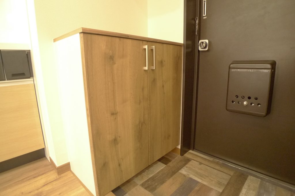 こちらは、玄関のシューズボックス、いわゆる下駄箱です。玄関土間とコーディネートした柔らかな木目調デザインです。天井までのトールタイプではありませんので、靴の収納する数は限られますが、一方で、腰高の位置の天板にお花やマスコットなどのインテリアを置いたりできます。