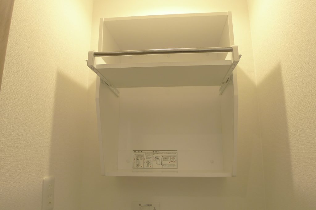 こちらは、洗濯機置場の横の棚です。住む人のスタイルに合わせて、棚の高さを変えられるタイプです。