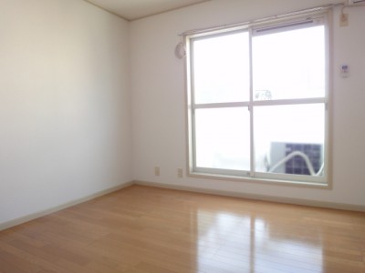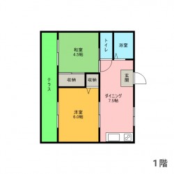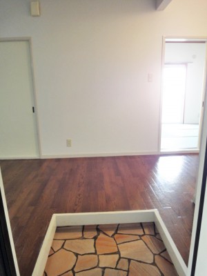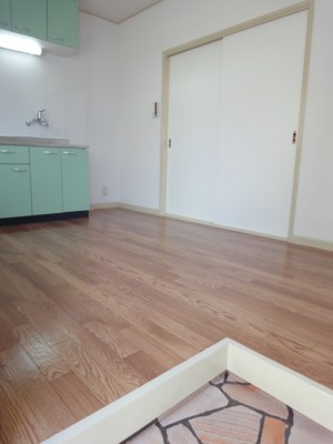 玄関を開けると約7.5帖のダイニング。さっそくキッチンが見えます。フローリング床なのでお手入れ、お掃除がしやすいですよ。奥は約6帖の洋室です。