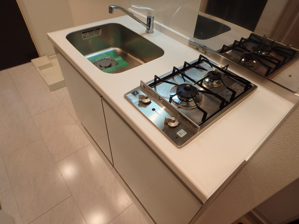 大理石調のキッチン。ガスコンロ・シングルレバー水栓を採用。排水口の周りを緑色のテープで囲ってあるのは、排水口が乾燥することで下水のにおいが上がってくるのを防ぐため。もちろん、ご入居後は外してお使いいただけます。