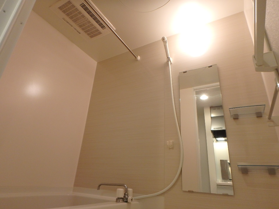 縦長の姿見鏡がついています。上品なカラーパネルにクリアカラーの棚がマッチしていますね♪ 見上げると浴室乾燥機がみえます。雨の日も洗濯物が乾かせるスグレモノ!