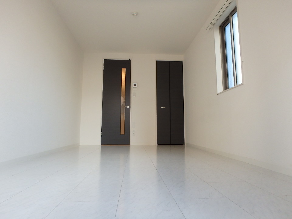 バルコニー側からお部屋を撮影しました。右奥の扉はクローゼット。扉と扉の間に小さなモニターが見えますね。こちらはインターホン内蔵のカメラから送られた画像を確認するためのもの。