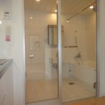 ▼大胆なガラス張りの浴室。こちらのお部屋ではトイレ・洗濯機置場が同室にあります。中が広いので使いやすそうです。