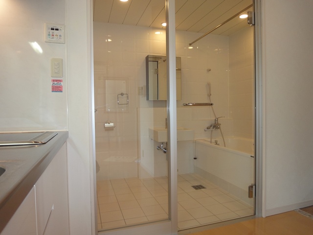 ▼大胆なガラス張りの浴室。こちらのお部屋ではトイレ・洗濯機置場が同室にあります。中が広いので使いやすそうです。