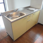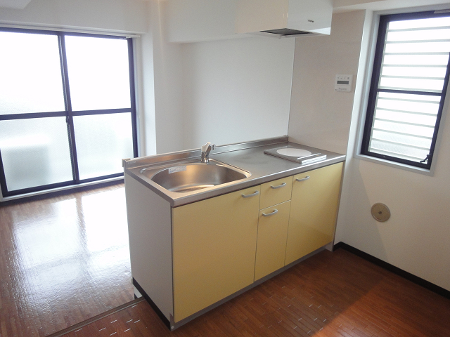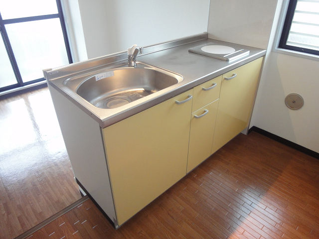 ▼ワンルームタイプでは 珍しい、カウンター式のシステムキッチン。IHクッキングヒーターが採用されております。右側にある窓からの日差しで、手元も暗くなりません。